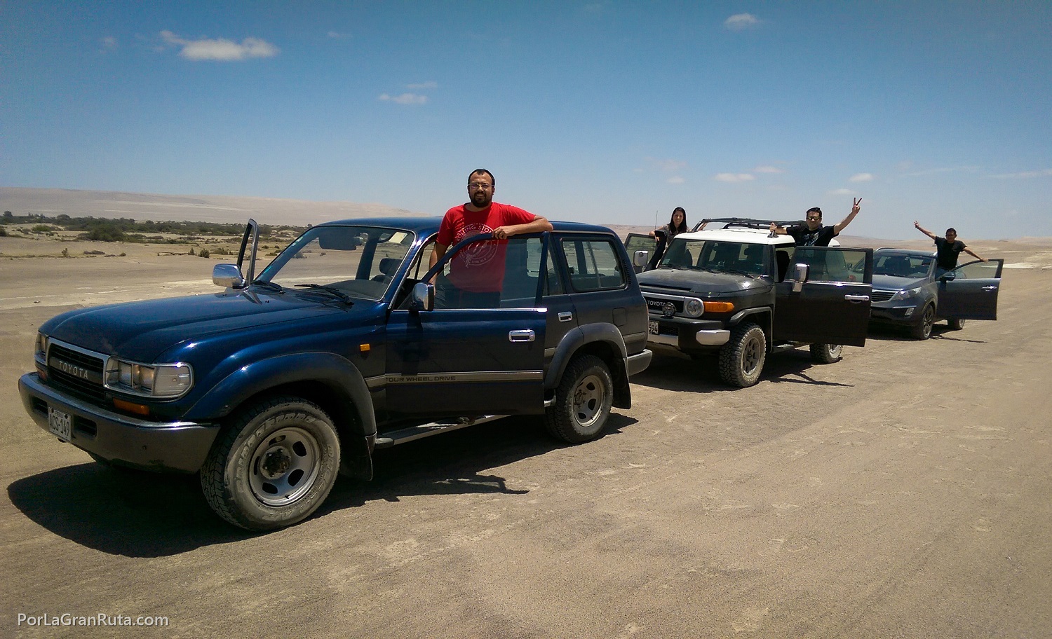 Quedamos el domingo 16 de octubre en encontrarnos a las 5:30 am en el grifo Kio que está pasando el primer peaje de la Panamericana Sur. Llevábamos parrilla y algunas cosas para almorzar allá en el desierto. La primera misión del día fue conseguir el hielo. En Kio no había, ni en los siguientes 2 grifos. Felizmente, en el tercero encontramos y pudimos proseguir.