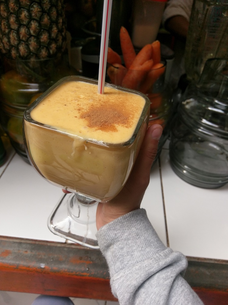 El segundo día, salimos 7am a desayunar al mercado que está en la plaza. Un potente desayuno con jugos de fruta y panes con queso y palta, todo muy rico y por sólo seis soles.