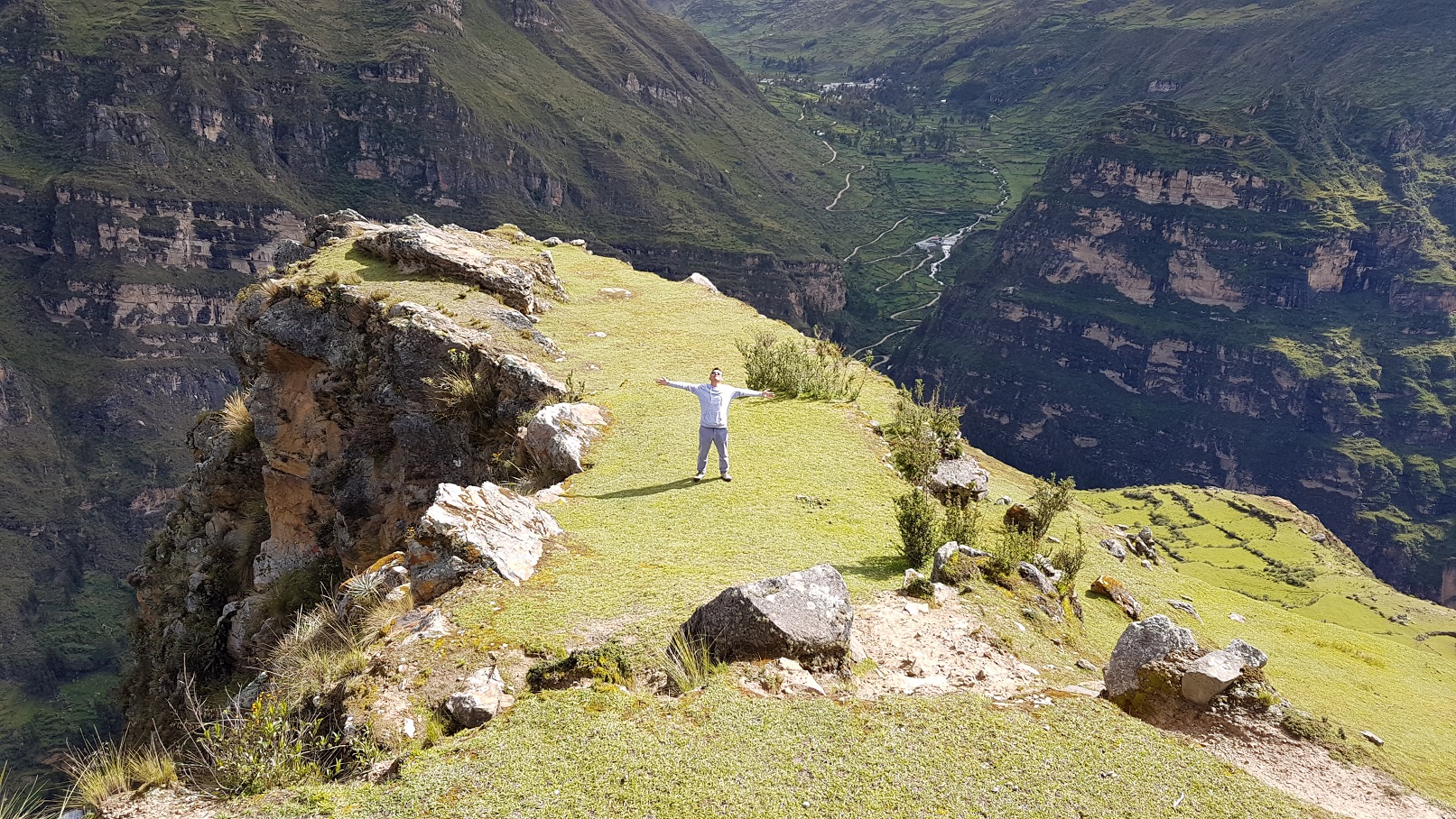 Una vez arriba, se tiene una vista panorámica espectacular de los alrededores. Se puede ver el camino por el que vinimos desde Oyón el día anterior. Del mismo modo, el poblado de Huarautambo, el centro de Yanahuanca y el recorrido del río Chaupihuaranga, el más importante de la zona. Estuvimos en el lugar cerca de una hora tomando fotos y admirando el paisaje.